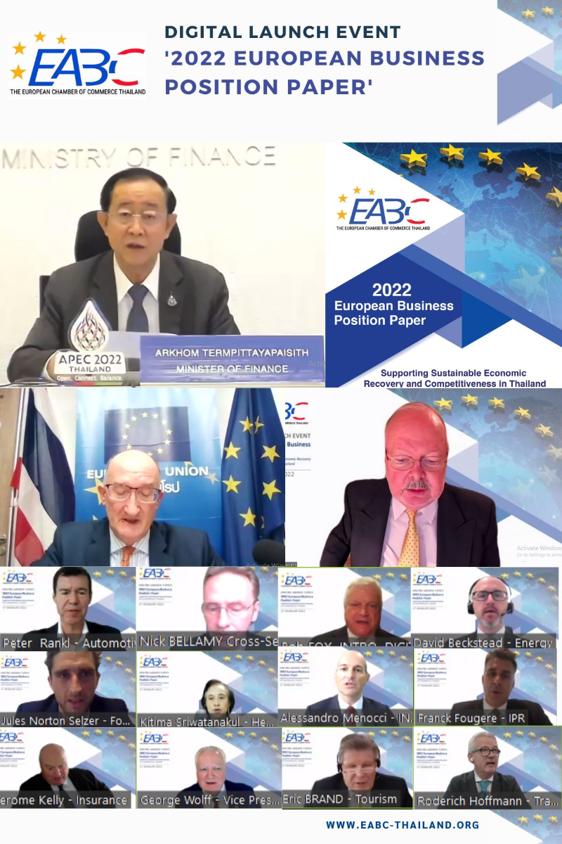 The Digital Launch of the 2022 European Business Position Paper was held successfully on 27 January 2022 with the presence of H.E. Mr. Arkhom Termpittayapaisit, Minister of Finance as a keynote speaker and followed by Ambassador David Daly, EU Ambassador of the European Union to Thailand, sharing EU vision.