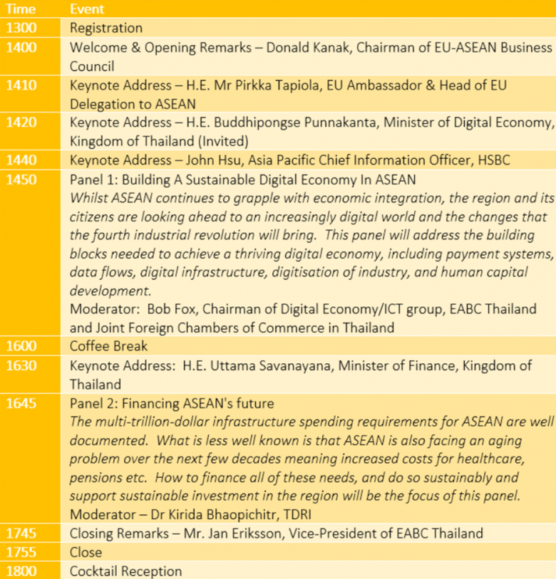 We are excited to meet all the delegates and partners to the EU-ASEAN Business Council’s annual flagship event, held in Bangkok this year. Every year, the summit is attended by a few hundred business leaders, thought-leaders and policy makers, who will present and debate key business and trade issues of the day.