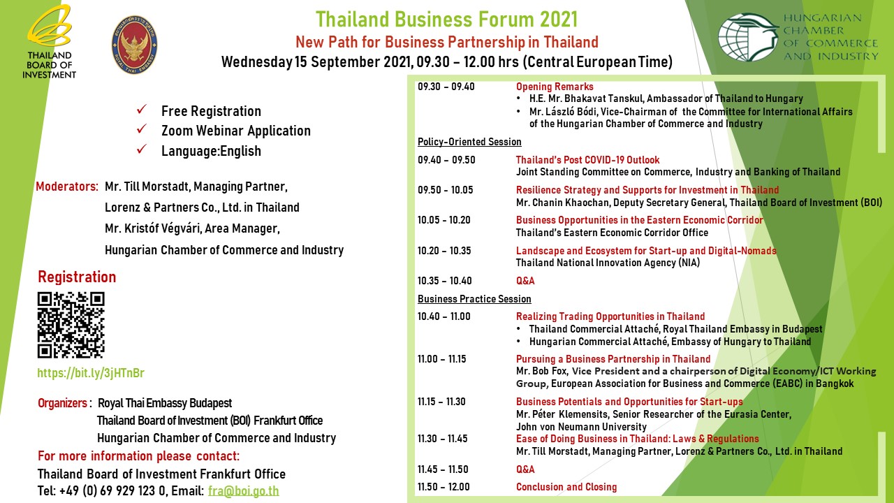 Thailand Board of Investment (BOI) Frankfurt Office, Royal Thai Embassy Budapest, and Hungarian Chamber of Commerce and Industry (HCCI) is organizing Thailand-Hungary Business Forum 2021 webinar on the topic of “New Path for Business Partnership in Thailand” to update you on business and investment opportunities of Thailand and Hungary. EABC Vice President and Digital Economy/ICT Working Group Chair, Mr. Bob Fox will also participate in a Business Practice Session.