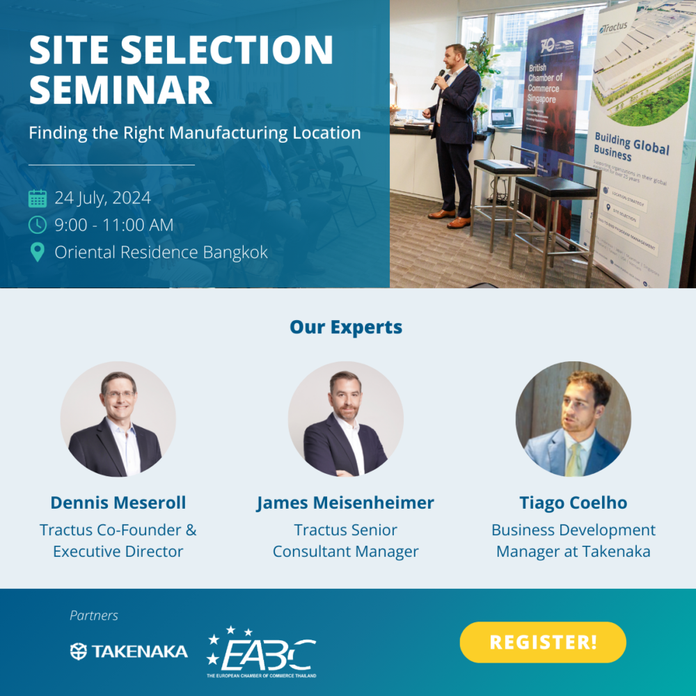 Unlock the secrets to successful manufacturing investments and expansions with Tractus and Takenaka Corporation, in collaboration with the EABC (European Chamber of Commerce Thailand).