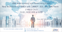 BCCT - 7th Floor, 208 Wireless Road, Lumphini, Pathumwan, BangkokEABC is organizing SME Matchmaking & Networking Event on 2 March 2017 at BCCT. You will get the most updated information about NEW Incentives for SMEs in Thailand from OSMEP, BOI and […]